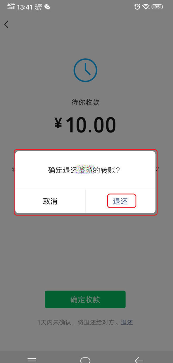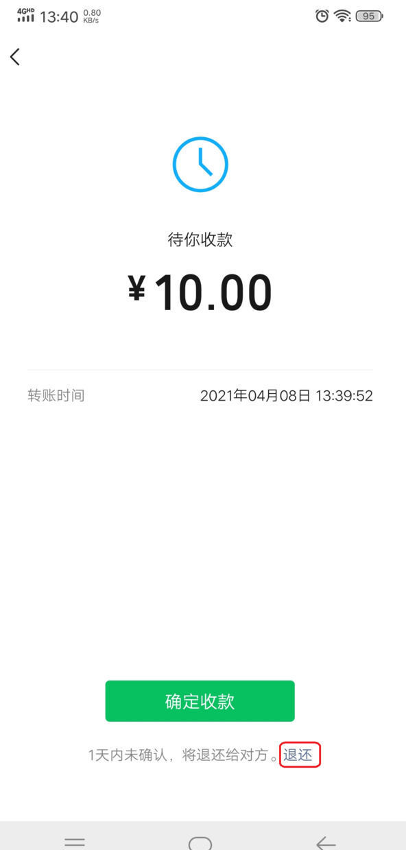 2.进入到转账的详情页面当中后,我们在【确认收钱】按钮的右下角,可以看到【退还】字样,点击它。