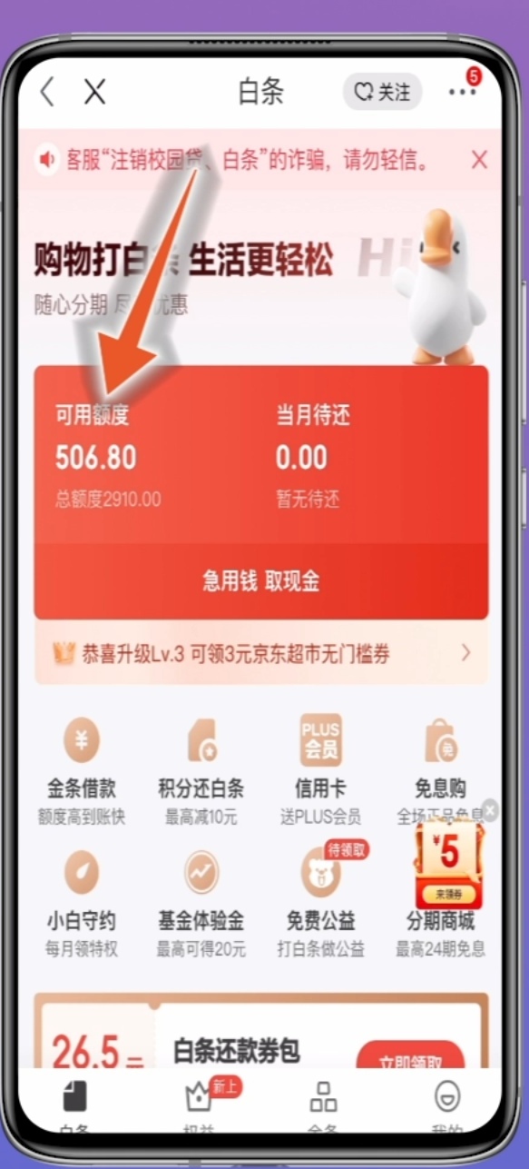 3、在白条界面,找到“可用额度”选项,点击它进入新界面。