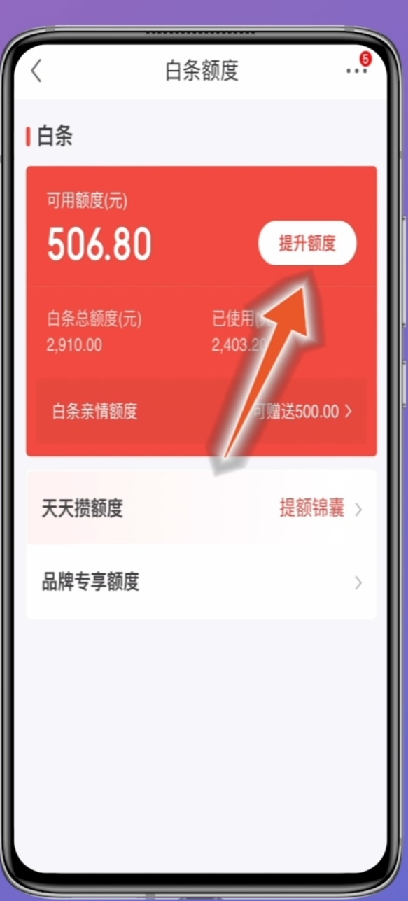 4、在新界面里,点击“提升额度”选项,即可提升白条的额度。