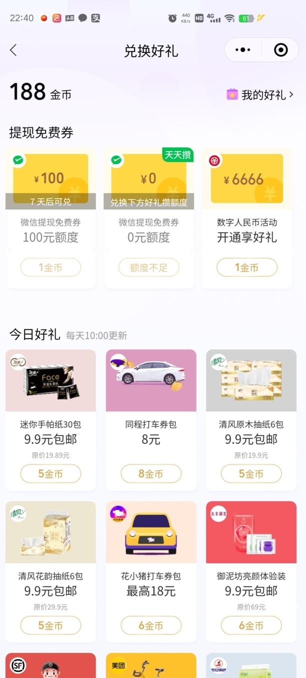 步骤3、点兑换好礼,进去后会有一个一百元的免费额度,兑换下面随便一个优惠还能再得一百额度,同一个实名下都可以操作,额度是通用的,每七天能兑换一次,节假日偶尔还会有额外,经常看看,可能有惊喜