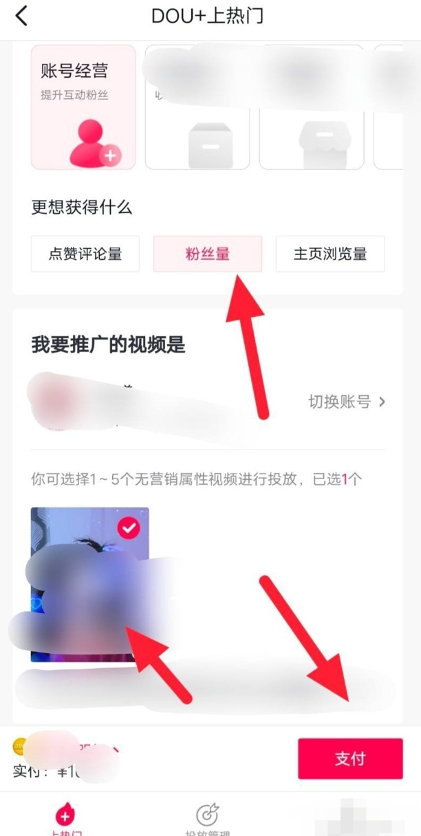 5、点击粉丝量,选择视频,点击支付完成,即可增加粉丝量。