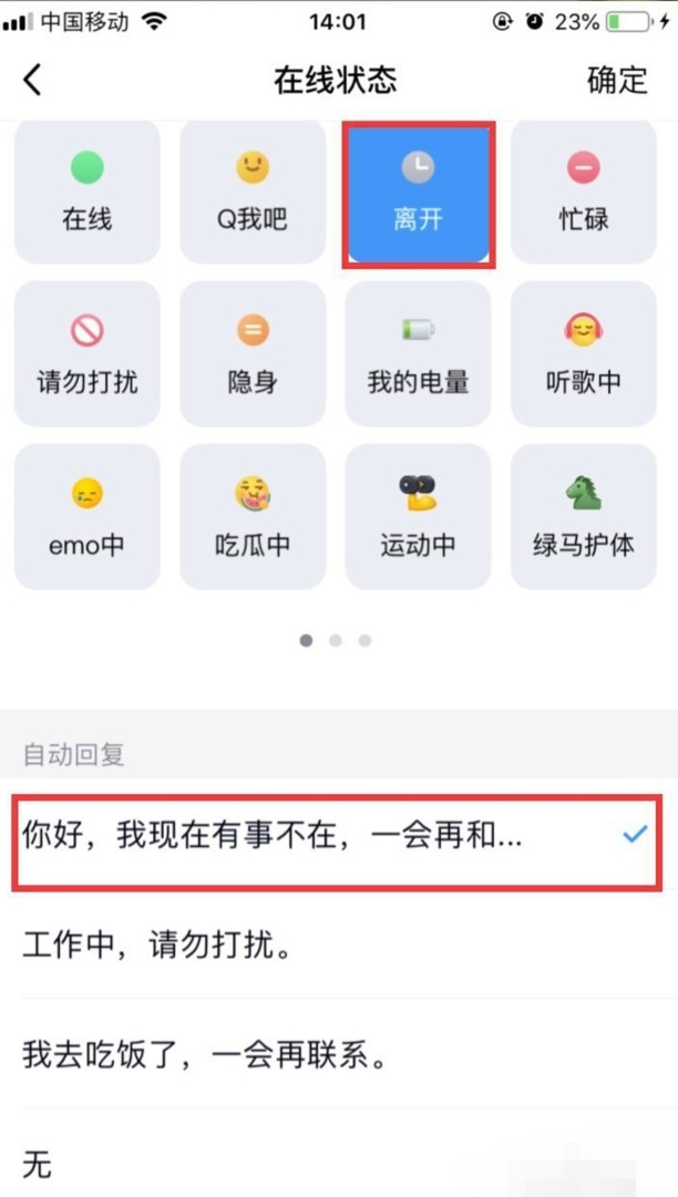 步骤5、切换“忙碌”、“请勿打扰”、“离开”中任意一条状态后,即可设置自动回复。