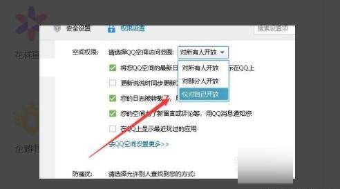 6.我们点击“请选择QQ空间访问范围”下拉菜单,在弹出菜单中选择“仅对自己开放”菜单项。这样其它人就无法访问我们的QQ空间了,在访问的时候会弹出限制访问的提示。