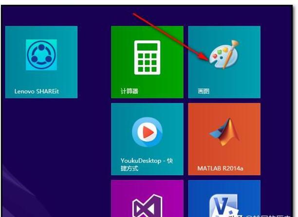 2、然后打开画图软件,点击下图红色箭头所示的图标。注: Windows版本不同,进入画图软件的方式不同,这里以Win8举例。