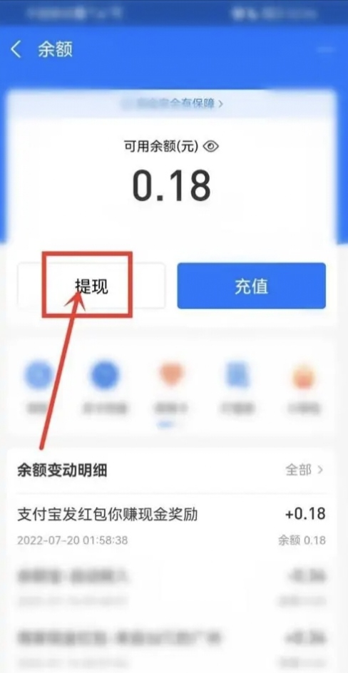 3、打开到余额页面,在扫码领红包现金奖励到账之后,选择页面上方“提现”。