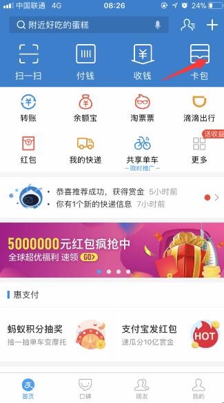 第一:打开支付宝首页里面的卡包,右上角第一栏,如图。