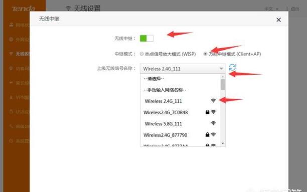 3.第二种方案就是需要用设备来辅助,如果自己家里有路由器的话,可以将路由器设置为中继模式,是别人家的的WIFI信号中继过来,这个功能比用手机直接去连接效果要稍微好一点,但是也是有距离的限制。